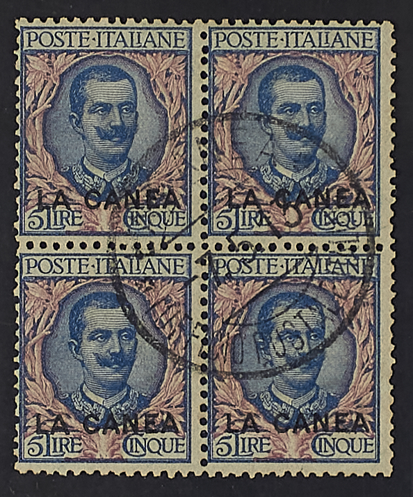 1906 - Floreale 5 l. blocco di quattro usato - Cert. Raybaudi