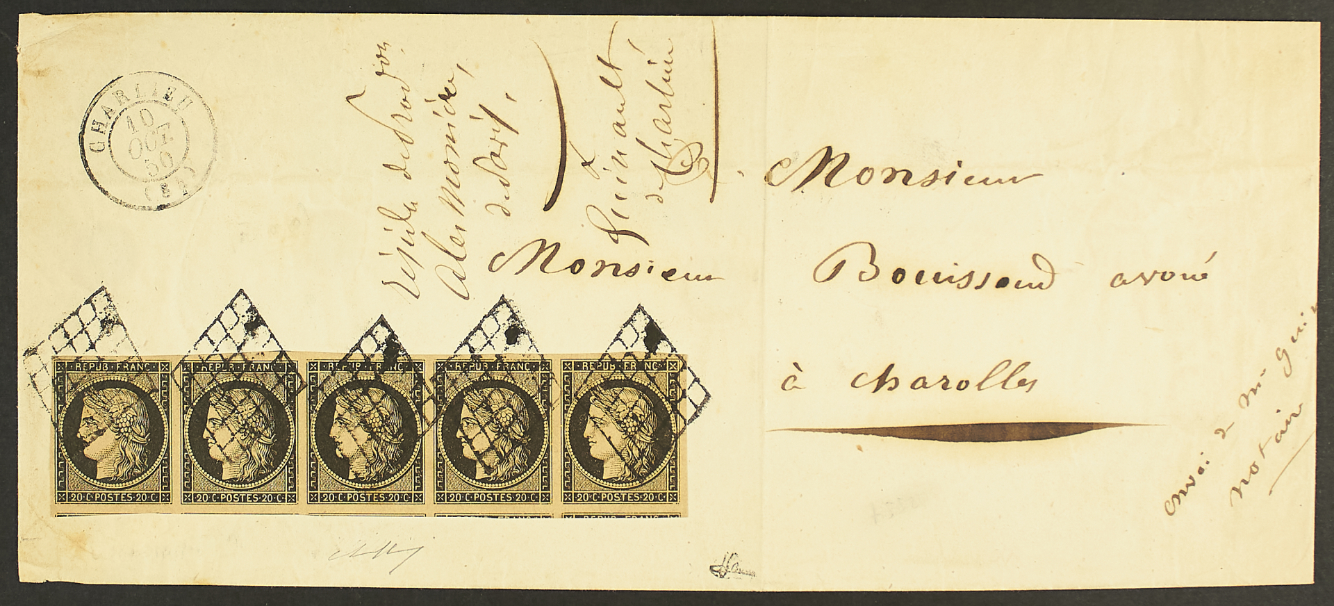 1949 - Prima emissione 20 c. nero su carta camoscio striscia orizzontale di cinque esemplari su lettera del 10 ottobre 1850 da Charlieu per Charolle - Molto bella - Cert. Brun e Von Der Weid - Forma A.G. Bolaffi