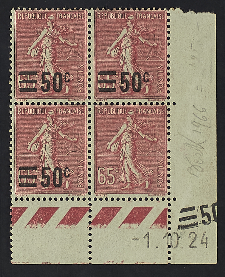 1927 - Soprastampati 50 c. / 65 c. blocco di quattro angolo di foglio inferiore destro - Esemplare in basso a destra non soprastampato a causa di piega diagonale (soprastampa obliqua nel margine) - Non comune - Cert. Behr