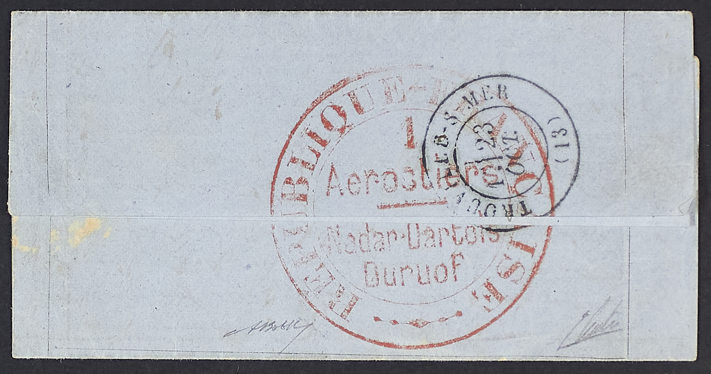 1870 - Ballon Monté "Le Victor Hugo" del 14 ottobre per Trouville sur Mer affrancato con 20 c. con il bollo "Aérostiers" in rosso al verso - Molto raro - Cert. Calves - Firma A.G. Bolaffi