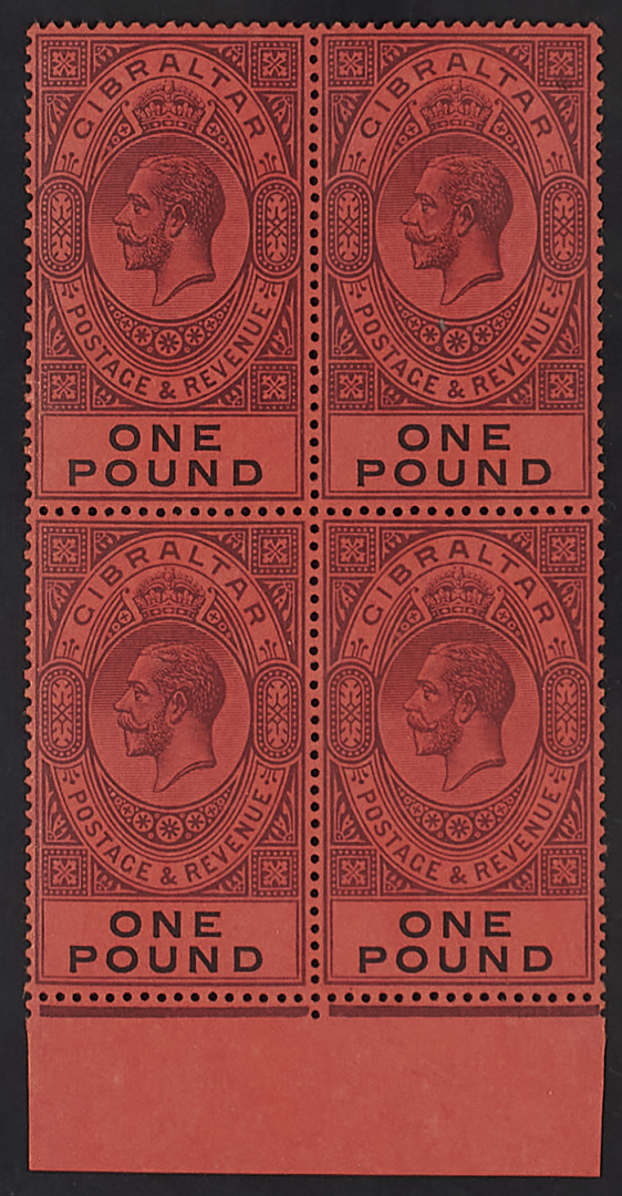 1912 - Giorgio V 1 £. violetto e nero su carta rossa blocco di quattro bordo di foglio inferiore