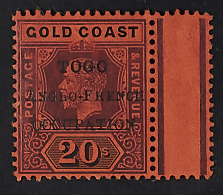 1916 - Occupazione anglo-francese 20 s. violetto e nero su carta rossa bordo di foglio a destra