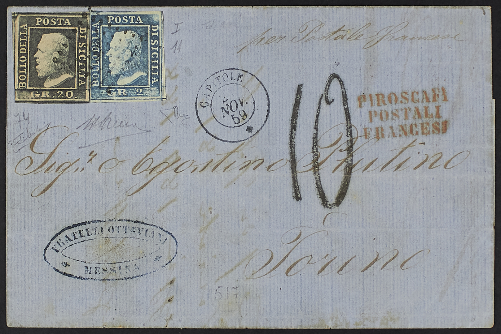 1859 - 20 gr. grigio ardesia + 2 gr. I tavola azzurro chiaro carta di Palermo su lettera del 21 novembre da Messina per Torino - La missiva fu impostata direttamente a bordo del piroscafo francese "Capitale" che annullò con bollo a punti e piccola ancora mettendo sulla soprascritta il bollo  e data dell'imbarcazione - Documento unico noto e ben conservato - Cert. Diena - Firma Renato Mondolfo