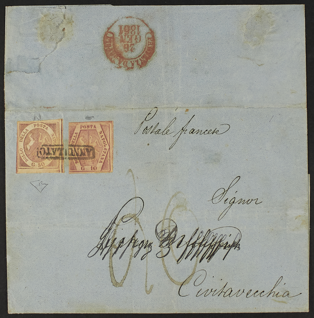 1858 - 50 gr. rosa brunastro + 10 gr. II tavola carminio rosa su lettera del 26 gennaio da Napoli per Civitavecchia - Indirizzo parzialmente cancellato - Da esaminare il solo 10 gr. ma alto valore ben conservato - Cert. Diena - Unita altra lettera molto rovinata e difettosa dell'aprile 1859 da Napoli per Roma con la medesima affrancatura
