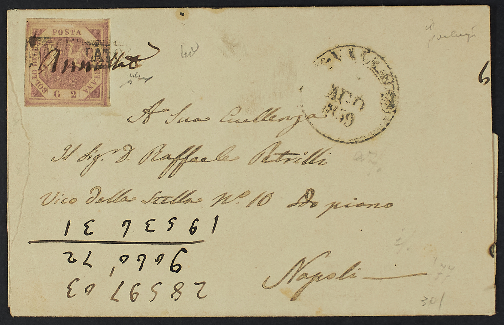 1859 - Annullato - Corsivo manoscritto annullatore congiunto con cartella di 2 gr. su lettera del 30 agosto da Licusati per Napoli - Unito 2 gr. sciolto con solo annullo a penna - Da esaminare - Firma Chiavarello