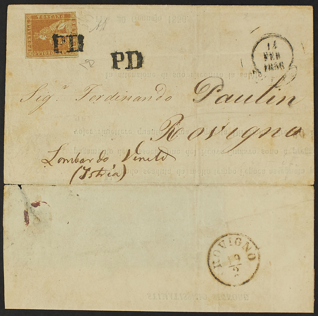 1851 - 1 s. bistro arancio su carta grigia su circolare del 14 febbraio 1856 da Pisa per Rovigno (Istria) - Unito frontespizio di circolare del 27 marzo 1857 da Firenze per Rovereto con medesima affrancatura - Da esaminare - Cert. Diena - Firma Chiavarello