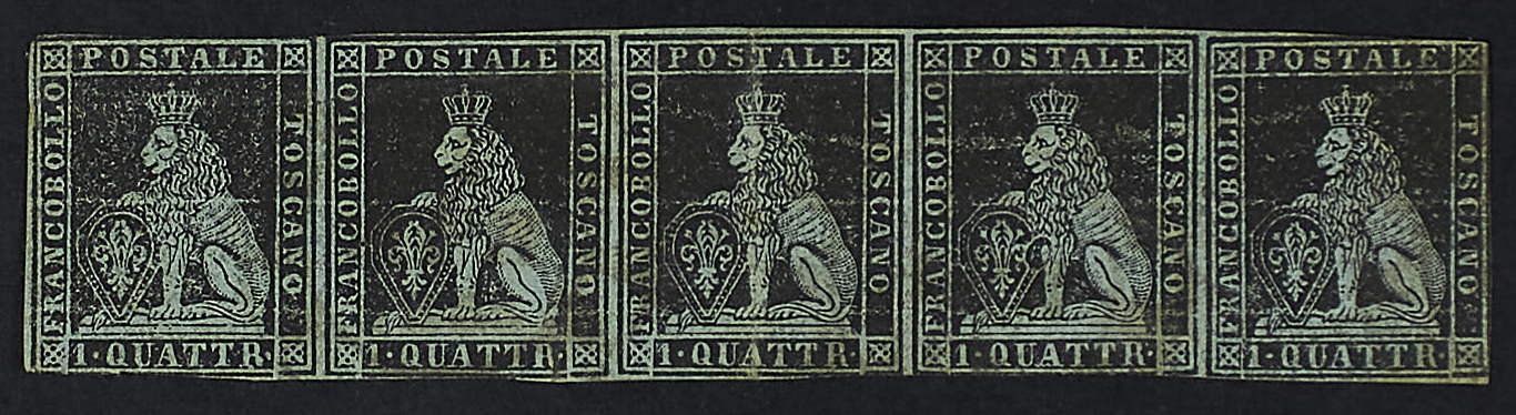 1851/57 - Insieme di multipli in strisce orizzontali con pezzi anche rari (tra cui 1 q. nero striscia di cinque) - Unita striscia di tre dell'1 cr. carminio II emissione - Da esaminare - Firme Bargagli, Chiavarello, E. Diena, A.D., En. Diena e Oliva