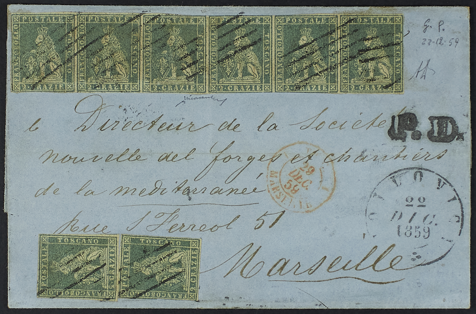 1857 - 2 cr. azzurro coppia verticale + striscia orizzontale di sei esemplari su lettera del 22 dicembre 1859 da Follonica per Marsiglia - Mancanza di un 2 crazie, asportato o perduto, all'altezza della striscia ma documento di grande rarità - Da esaminare - Cert. Diena - Firma Chiavarello