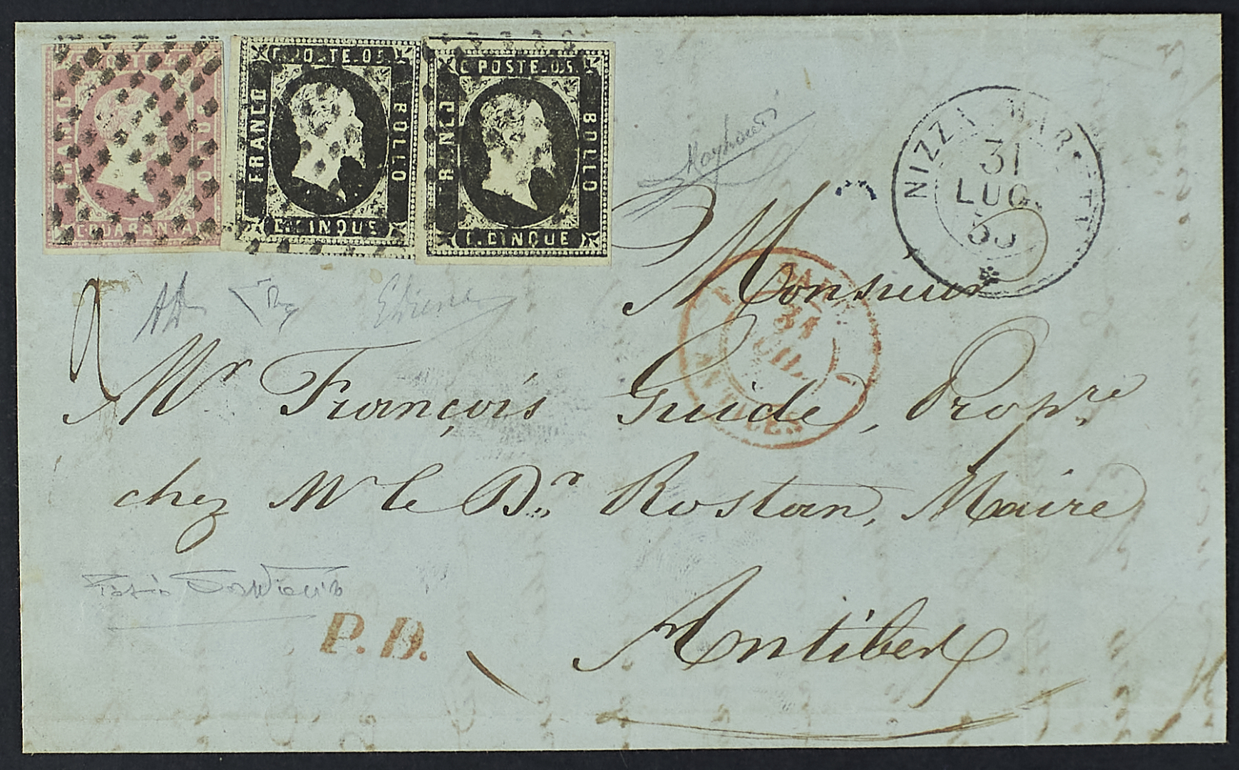 1851 - 5 c. nero due esemplari + 40 c. rosa su lettera del 31 luglio 1853 da Nizza Marittima per Antibes - Un francobollo da 5 c. leggermente corto in alto - Cert. Diena - Firma Raybaudi