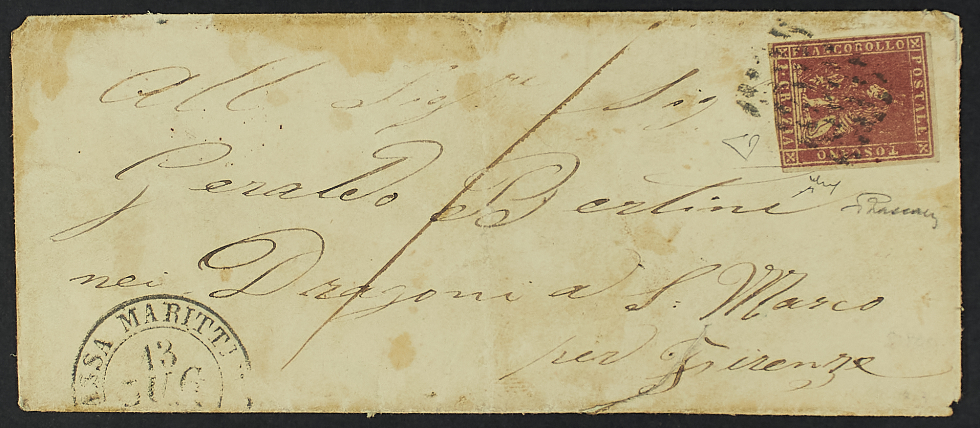 1857 - 1 cr. carminio II emissione isolato su busta di piccolo formato del 13 luglio 1859 da Massa Marittima per Firenze - Una delle tre lettere note con questa tariffa in periodo di Governo Provvisorio e affrancatura di grande rarità - Tre margini completi (due molto ampi), lievemente intaccato quello inferiore - Cert. Diena