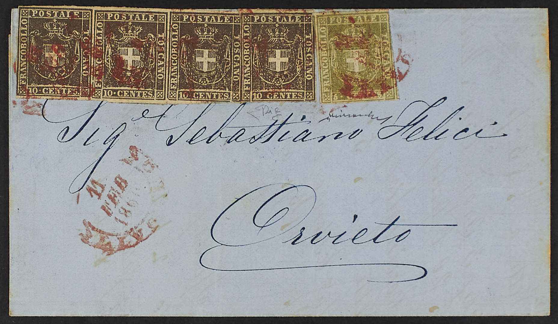 1860 - 5 c. verde + 10 c. bruno esemplare singolo e striscia orizzontale di tre su lettera dell'11 febbraio da Livorno per Orvieto - Documento molto fresco e affrancatura di triplo porto di rarità estrema - Cert. Diena - Firma Chiavarello