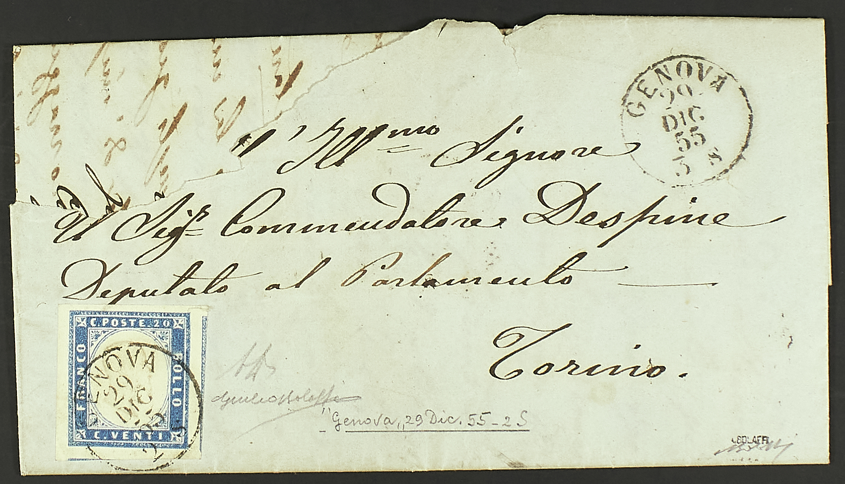 1855 - 20 c. cobalto su lettera del 20 dicembre da Genova per Torino - Splendido ed eccezionalmente marginato - Cert. Bolaffi e Diena
