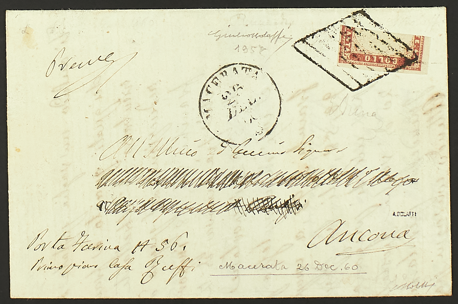 1855 - 40 c. rosso mattone chiaro frazionato verticalmente a metà per il porto di 20 c. su lettera del 26 dicembre 1860 da Macerata per Ancona - Documento di rarità estrema e splendidamente conservato - Cert. Bolaffi - Firma E. Diena