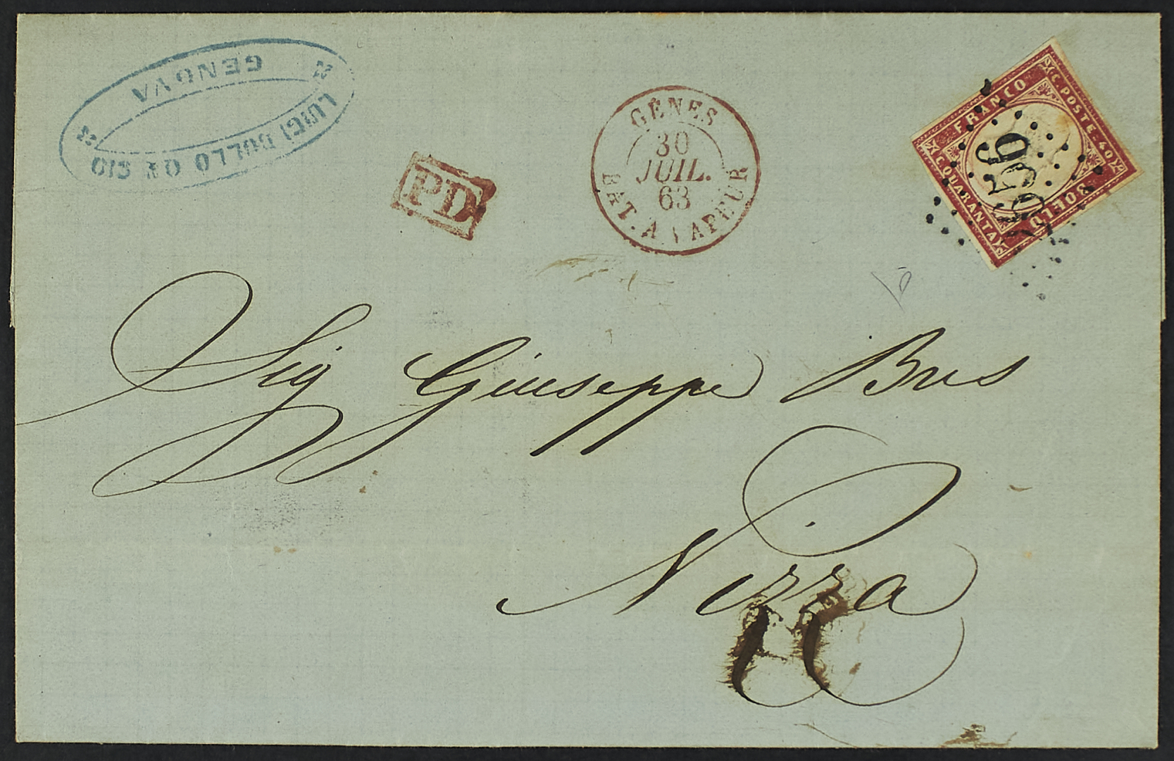 "2626" bollo a punti grandi cifre annullatore allo sbarco a Nizza di sardegna IV emissione 40 c. rosso vermiglio su lettera del 29 luglio spedita da Genova - Cert. Diena e Toselli
