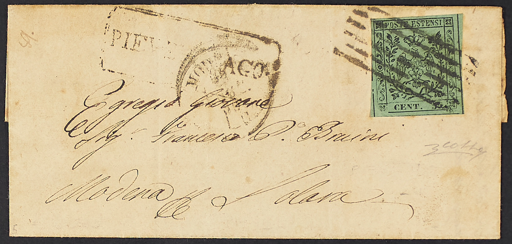 1859 - 5 c. verde con punto dopo le cifre isolato su lettera di piccolo formato del 26 luglio da Pievepelago, cartella a lato, per Solara - Documento raro - Cert. Colla