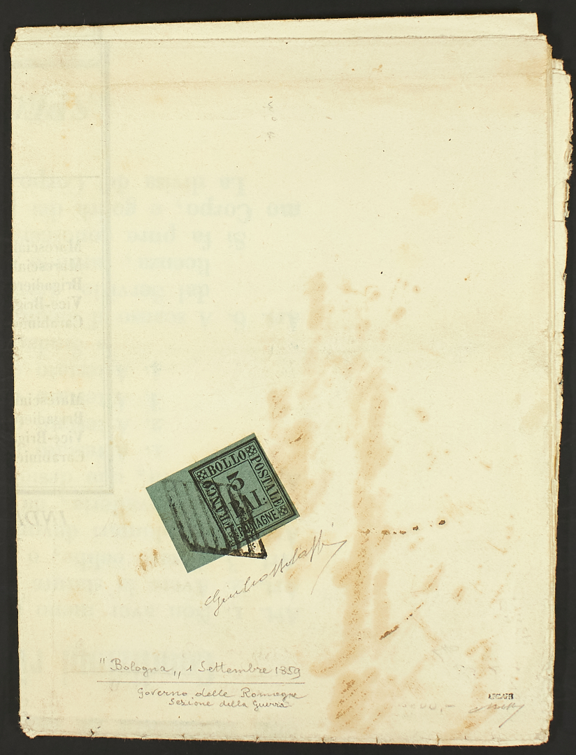 1859 - Giorno d'emissione - 3 baj. verde scuro bordo di foglio a sinistra su manifesto del 1° settembre per Casola - Estremamente raro - Unito manifesto del 20 giugno con bollo a tampone 1/2 baj. - Firme Giulio Bolaffi e A.G. Bolaffi