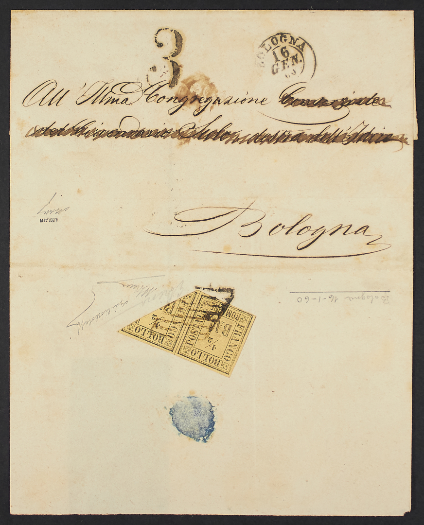 1859 - 1/2 baj. giallo paglia coppia orizzontale con l'esemplare di destra frazionato diagonalmente a metà per la tassa complessiva di 3 centesimi al verso di involucro di lettera del 16 gennaio 1860 da Bologna per città - Rara - Cert. Bolaffi e Diena