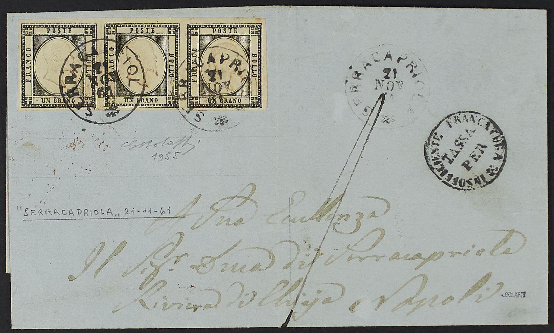 1861 - 1 gr. nero striscia orizzontale di tre esemplari su lettera del 21 novembre da Serracapriola per Napoli - Molto bella - Cert. Bolaffi