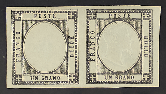 1861 - 1 gr. nero coppia orizzontale con esemplare senza effigie - Cert. Diena