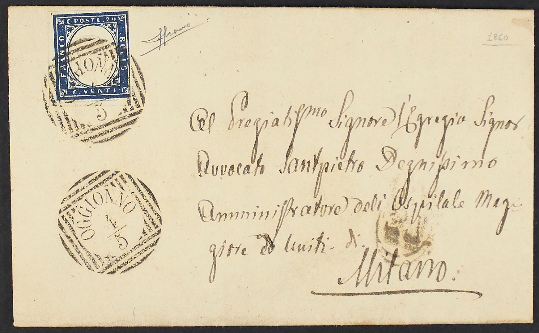 1860 - Oggionno - Linee verticali e orizzontali nitido annullatore di 20 c. azzurro su lettera del 4 maggio per Milano - Probabilmente la più bella lettera tra le poche conosciute - Cert. Sorani