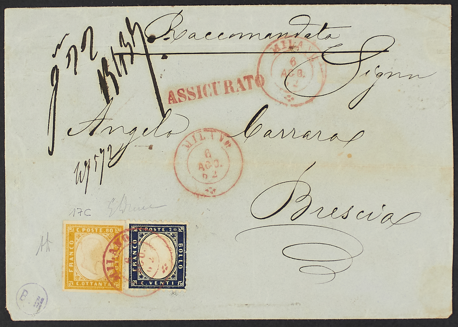 1862 - Prima emissione dentellata - 20 c. indaco in affrancatura mista con 80 c. giallo arancio chiaro su assicurata del 6 agosto da Milano per Brescia - Firme E. Diena e A.D.
