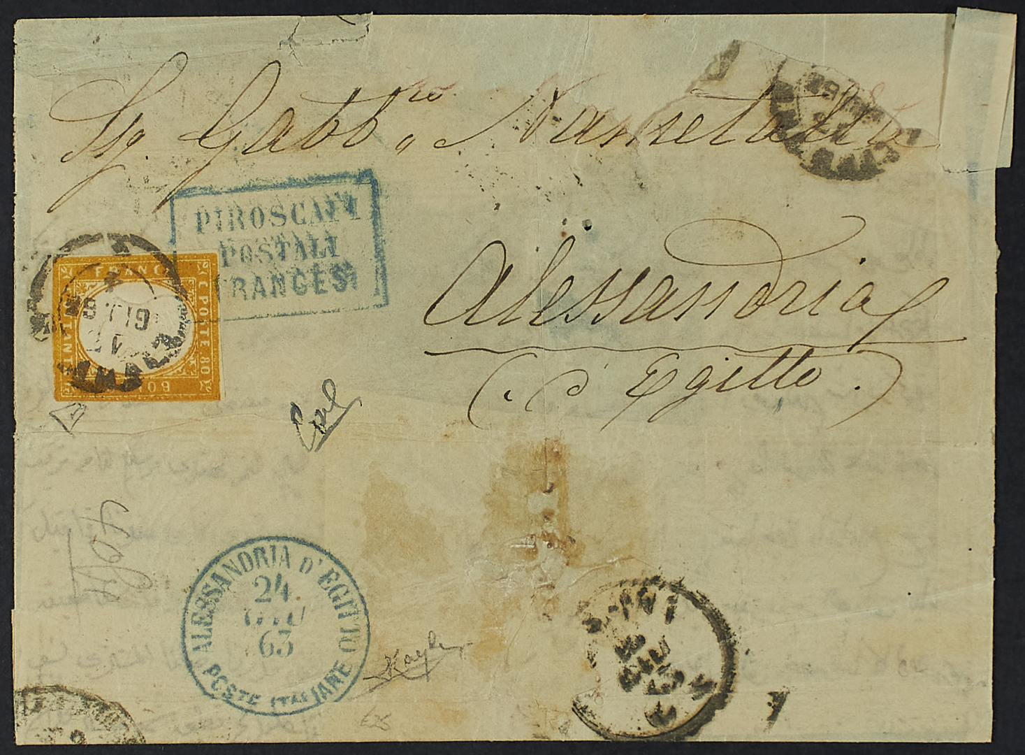 1862 - Prima emissione dentellata 80 c. giallo arancio isolato su grande frammento di lettera del 13 giugno da Livorno per Alessandria d'Egitto - Bollo azzurro in cartella "Piroscafi Postali Italiani" parzialmente annullatore e francobollo quasi totalmente tagliato con le forbici - Documento non comune - Da esaminare - Cert. Diena e Raybaudi