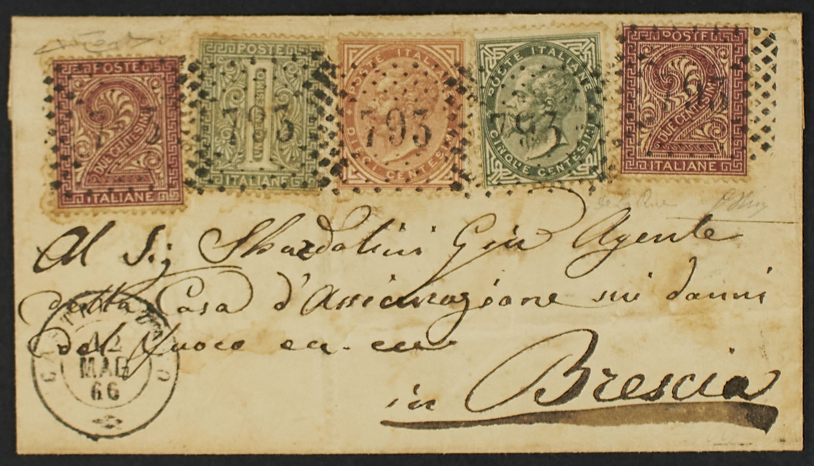 1863 - Definitiva 1 c. verde + 2 c. rosso due esemplari + 5 c. verde + 10 c. ocra in affrancatura "quadricolore" su lettera del 12 maggio 1866 da Castrezzato per Brescia - Firme Raybaudi e Oliva