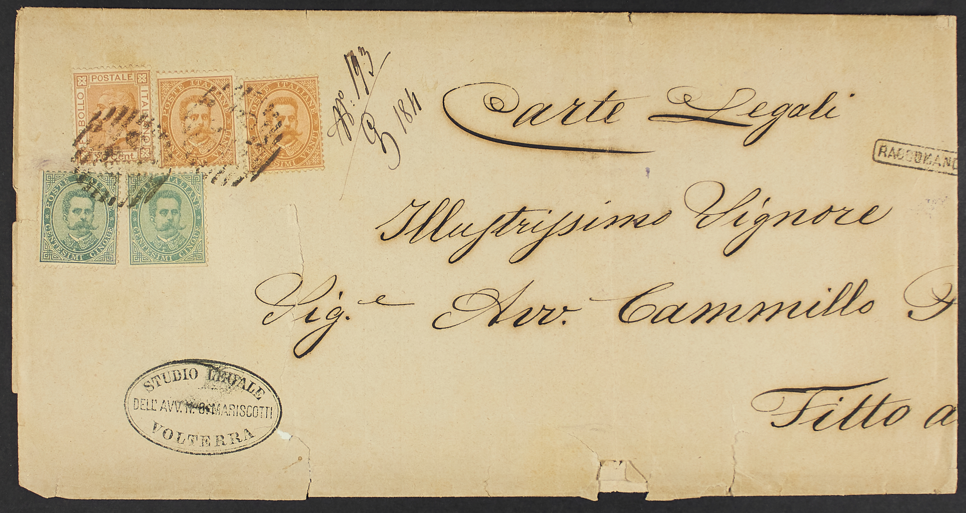 1877/79 - Nuovi valori 20 c. ocra arancio su affrancatura mista con Umberto I emissione 5 c. verde due esemplari e 20 c. arancio due esemplari su grande involucro di lettera (carte legali) del 20 maggio 1881 da Volterra per Fitto di Cecina - Combinazione unica nota e accostamento di valori "gemelli" - Da esaminare - Cert. Bottacchi