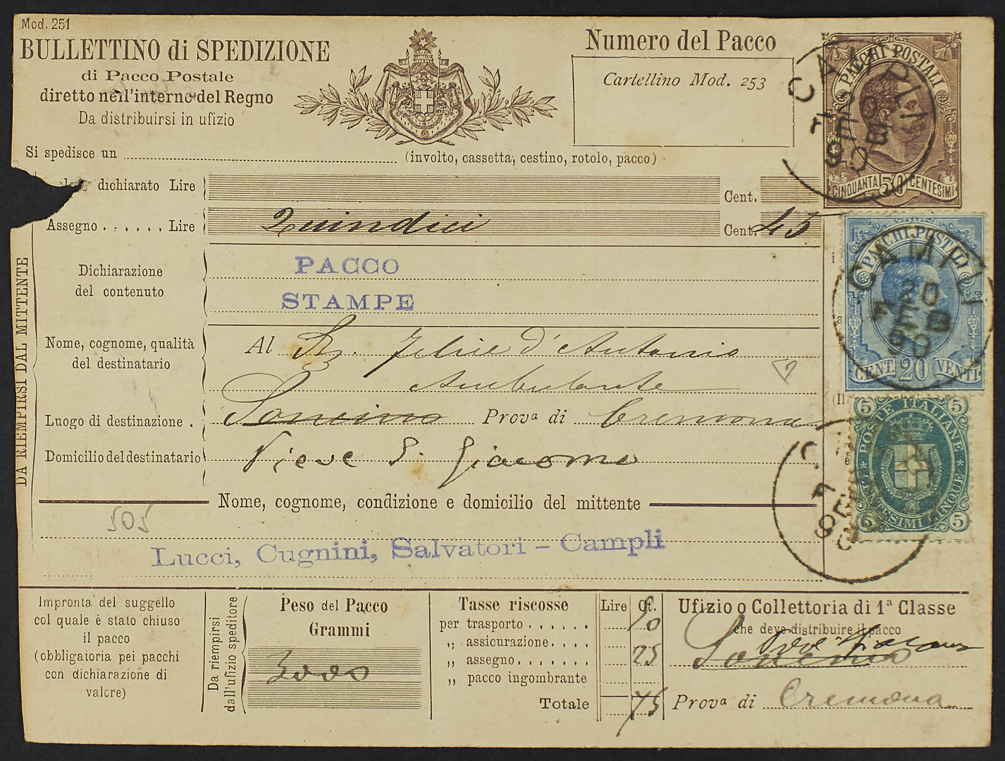 20 C. AZZURRO IN AFFRANCATURA CON UMBERTO 5 C. VERDE SU BOLLETTINO DI SPEDIZIONE DA 50 C. BRUNO
