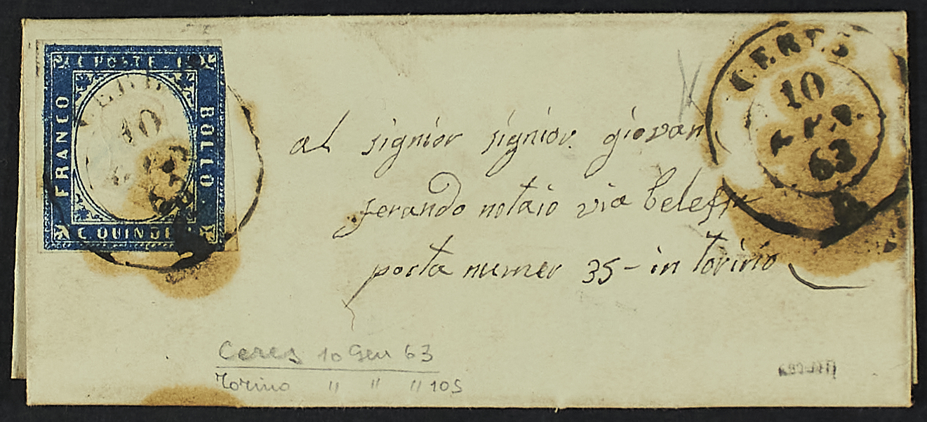 1863 - Ceres doppio cerchio "D" annullatore di 15 c. azzurro tipo Sardegna su lettera del 10 gennaio per Torino - Cert. Bottacchi