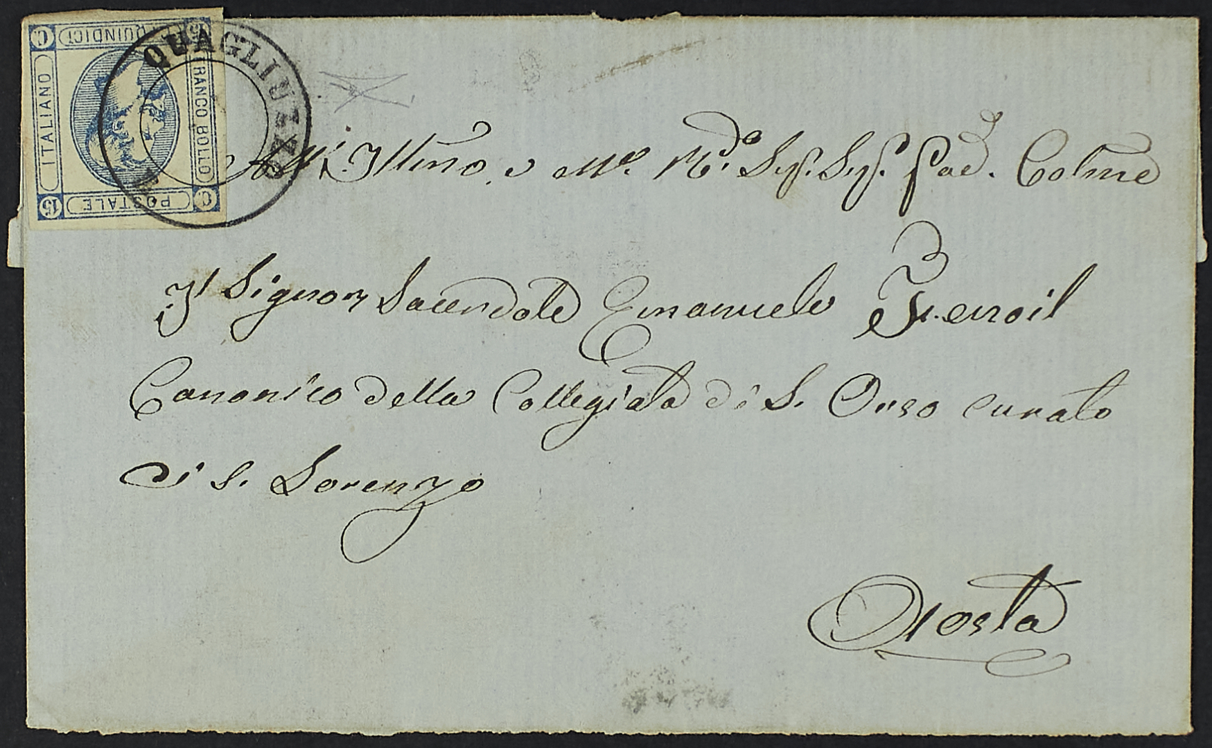 1863 - Quaglizzo doppio cerchio annullatore di 15 c. litografico II tipo su lettera dell' 11 novembre per Aosta - Cert. Bottacchi