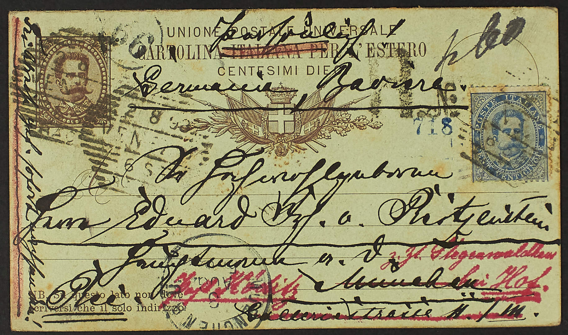 1882 - Cartolina postale per l'estero 10 c. con affrancatura complementare di 25 c. del 2 agosto 1893 da Venezia per Monaco di Baviera e rispedita ad altro indirizzo in città - Rispedita nuovamente il 9 agosto da Monaco per Venezia con il testo della risposta scritto sopra il precedente - Raro per la presenza della risposta anch'essa usata dall'estero all'Italia