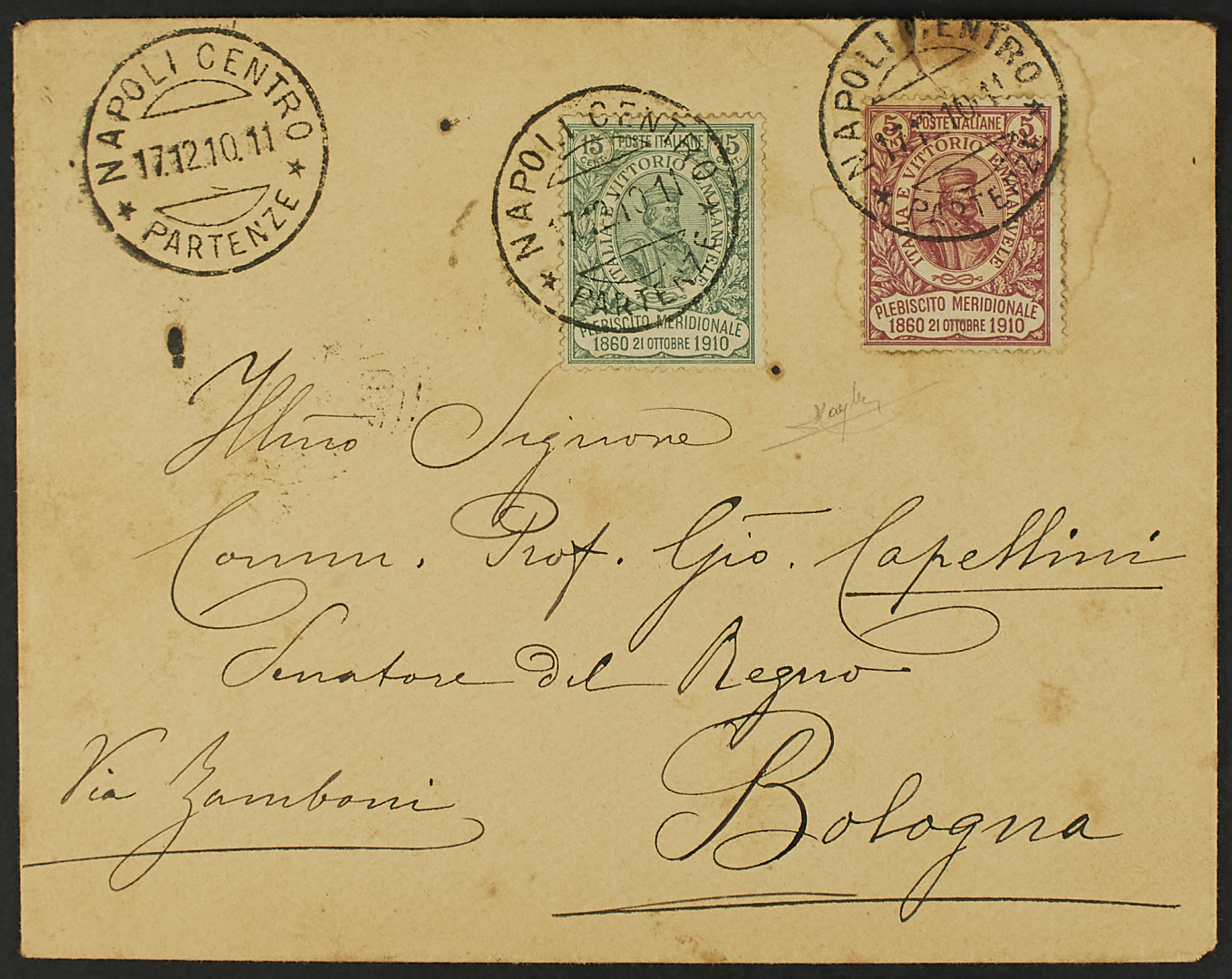 1910 - Garibaldi - I due alti valori su busta del 17 dicembre da Napoli per Bologna - Cert. Raybaudi