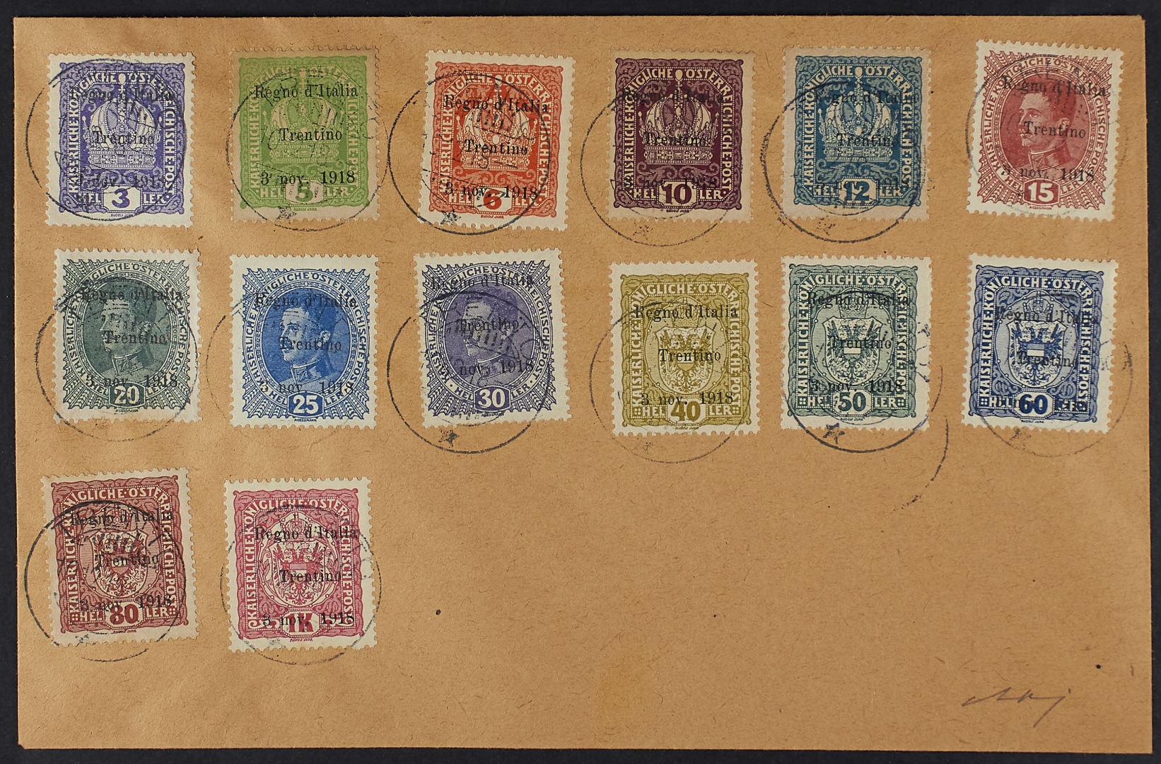 1918 - Emissione per la Venezia Giulia e per il Trentino - Due buste con i valori annullati rispettivamente fino all' 1 C. e fino all'80 h. + 1 C. - Cert. Bolaffi