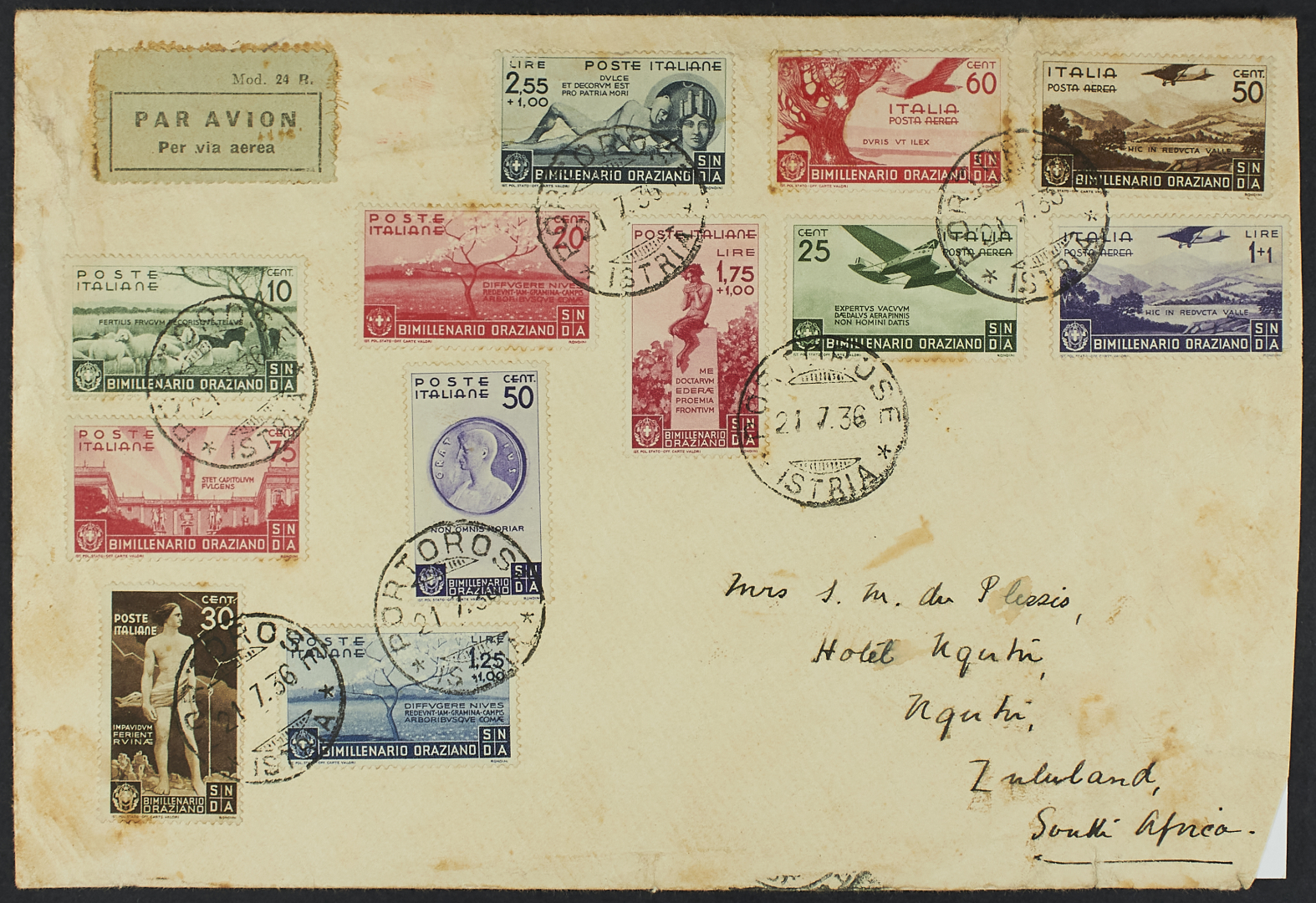 1936 - Orazio - La serie senza l'alto valore di posta aerea su raccomandata del 21 luglio da Portorose per il Sud Africa - Da esaminare