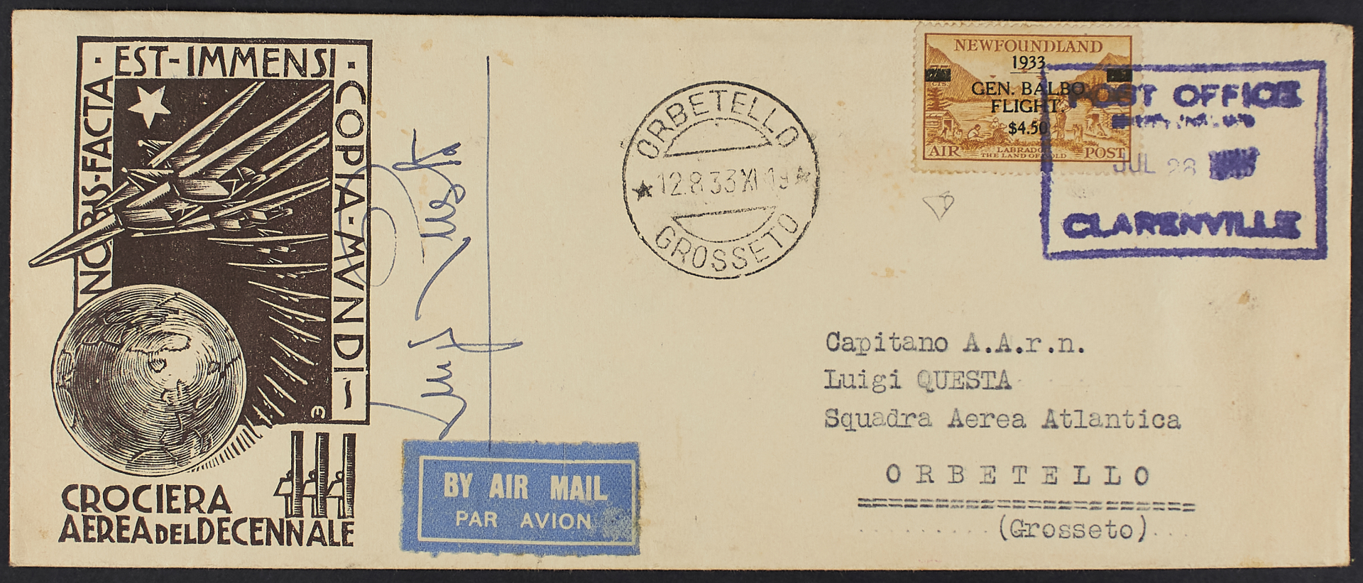 1933 - Balbo Terranova $ 4,50/75 c. bistro su aerogramma ufficiale del 28 luglio da Clarenville per Orbetello con firma autografa del Cap. Luigi Questa - Molto bello - Firma En. D.