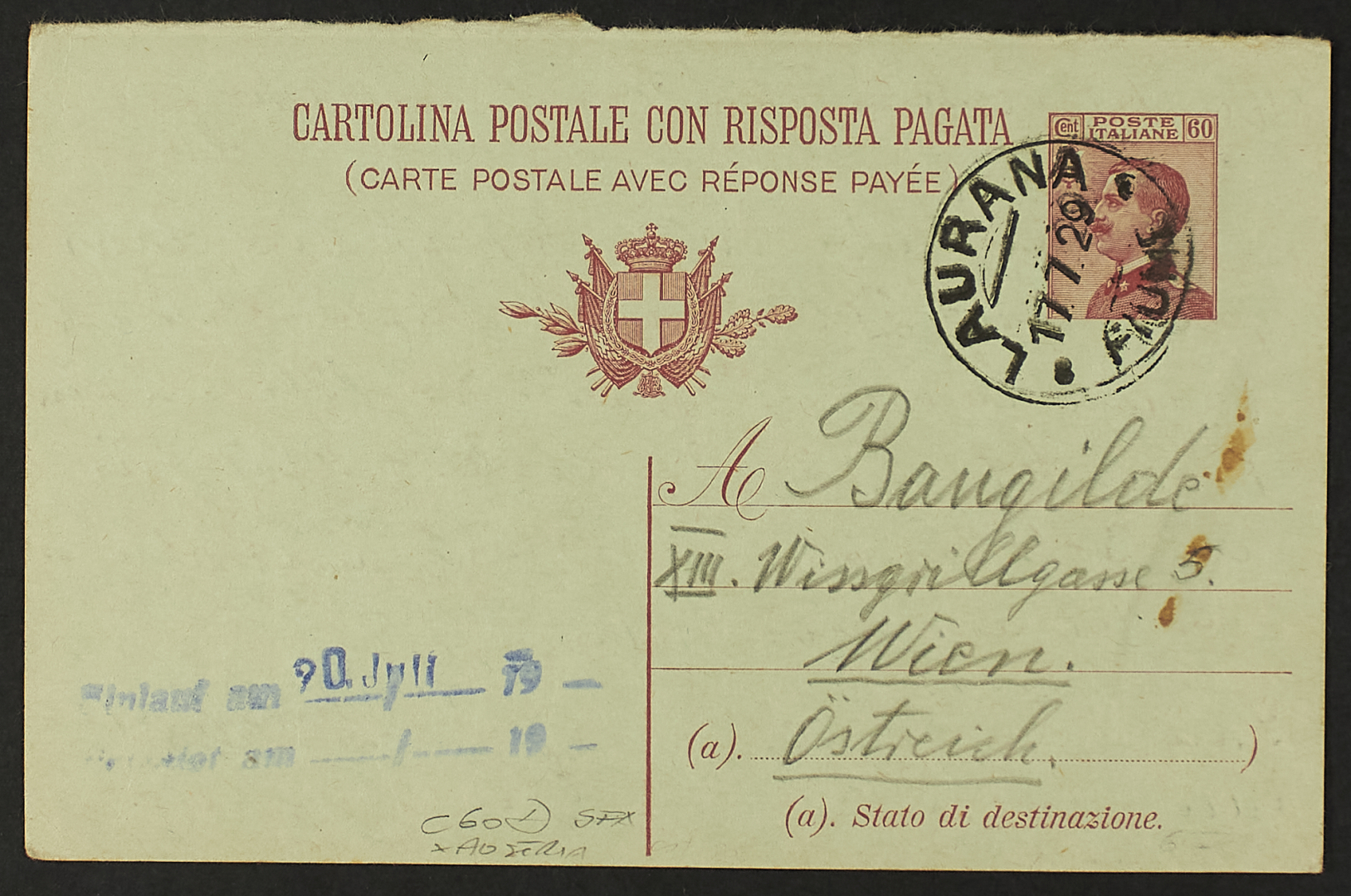 1925 - Cartolina postale con risposta pagata Michetti 60 c. dell'11 luglio 1929 da Fiume per Vienna (Fil. n. C60)