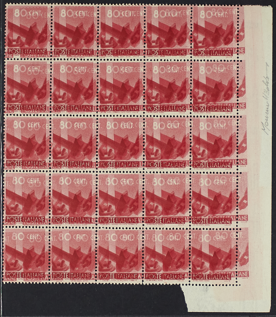 1945 - Democratica 80 c. blocco di 25 esemplari con doppia stampa - Non comune - Da esaminare