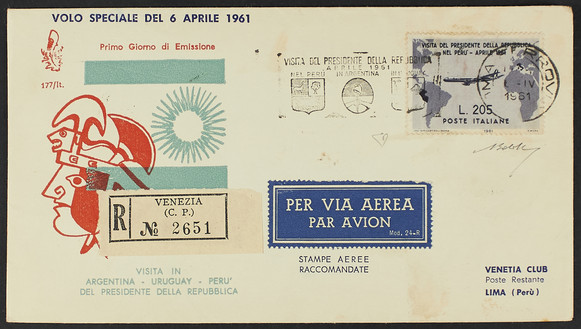 1961 - Gronchi Rosa 205 L. - L'aerogramma con l'esemplare ricoperto e timbro di arrivo a Lima - Unite le tre FDC degli altri valori della serie - Cert. Bolaffi - Firma En. D.