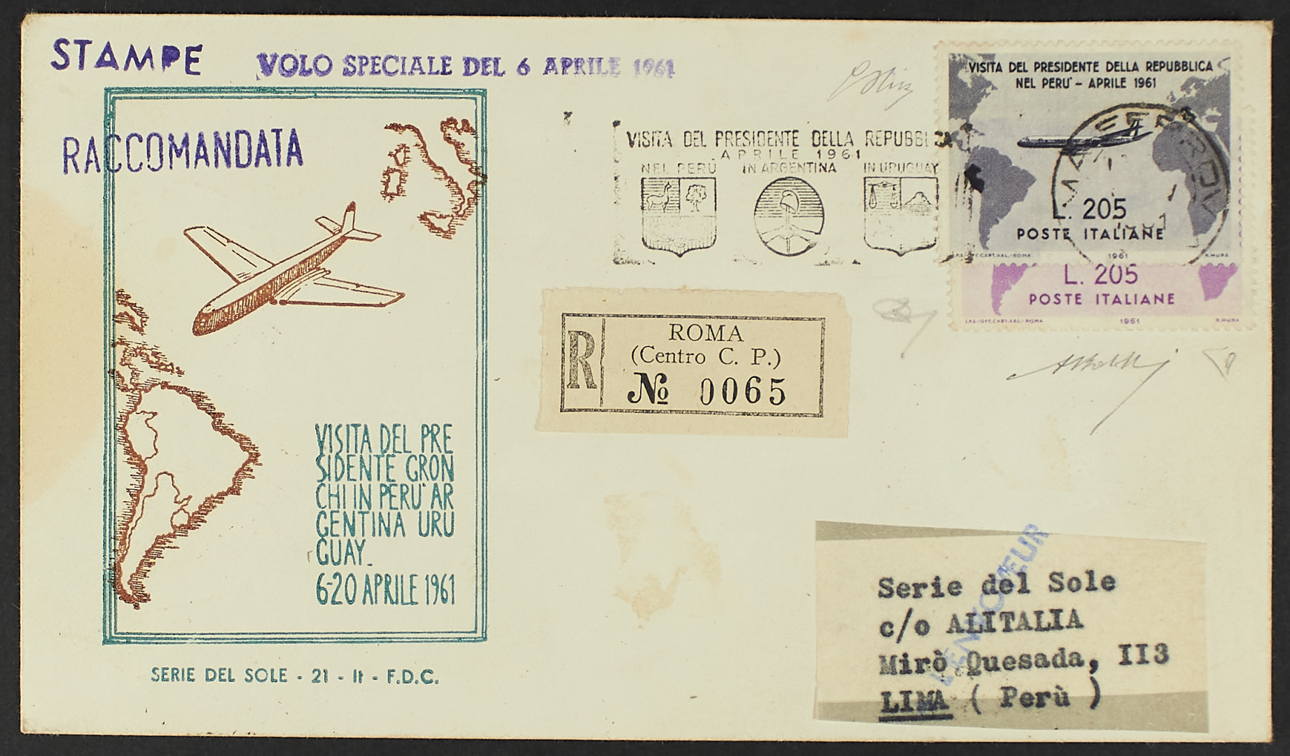 1961 - Gronchi Rosa 205 L. - L'aerogramma con l'esemplare parzialmente ricoperto (cimosa sbordante) e timbro di arrivo a Lima - Cert. Bolaffi e Diena - Firma Oliva