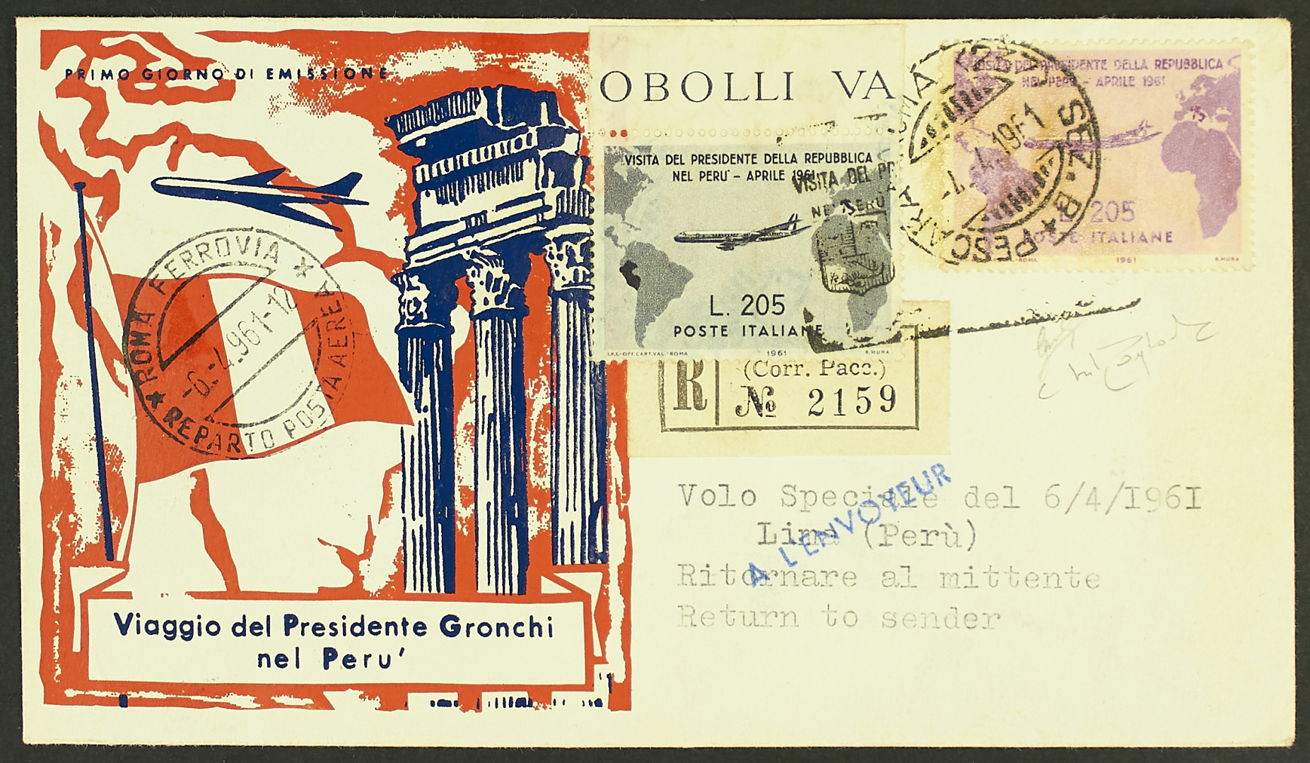 1961 - Gronchi rosa 205 L. affiancato dal 205 L. grigio bordo di foglio superiore su raccomandata aerea del 6 aprile da Roma per Lima e rispedita al mittente - Documento di notevole rarità - Da esaminare - Cert. Raybaudi