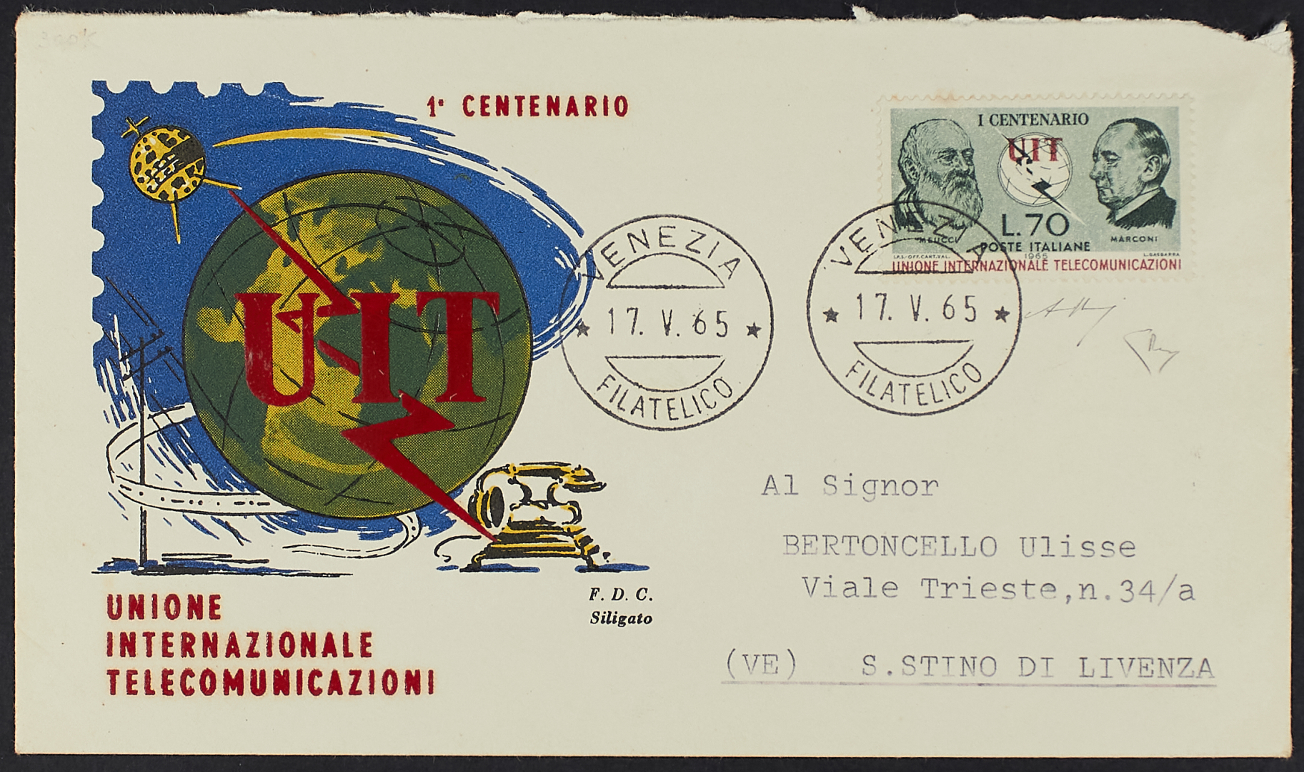 1965 - UIT 70 L. "Unione in basso" su busta primo giorno del 17 maggio viaggiata da Venezia per S. Stino di Livenza - Molto rara - Cert. Bolaffi e Diena
