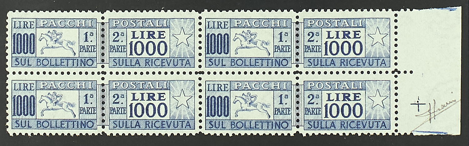 1954 - Cavallino 1000 L. oltremare blocco di quattro bordo di foglio a destra buona centratura - Cert. Sorani