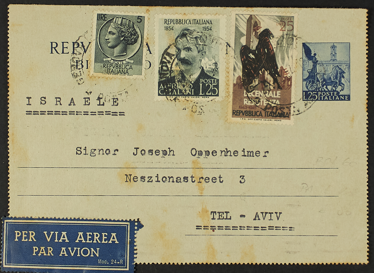 1951 - Biglietto postale 25 c. con affrancatura complementare di 55 L. del 24 giugno 1954 da Genova per Israele via aerea - Non comune (Fil. n. B 44)
