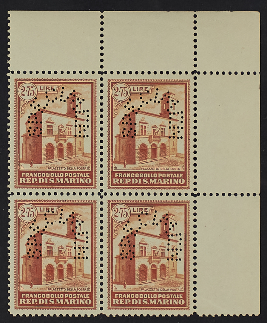 PALAZZETTO - SAGGIO 2,75 L. ARANCIO CON PERFORAZIONE "SPECIMEN" BLOCCO DI QUATTRO BORDO DI FOGLIO SUPERIORE DESTRO