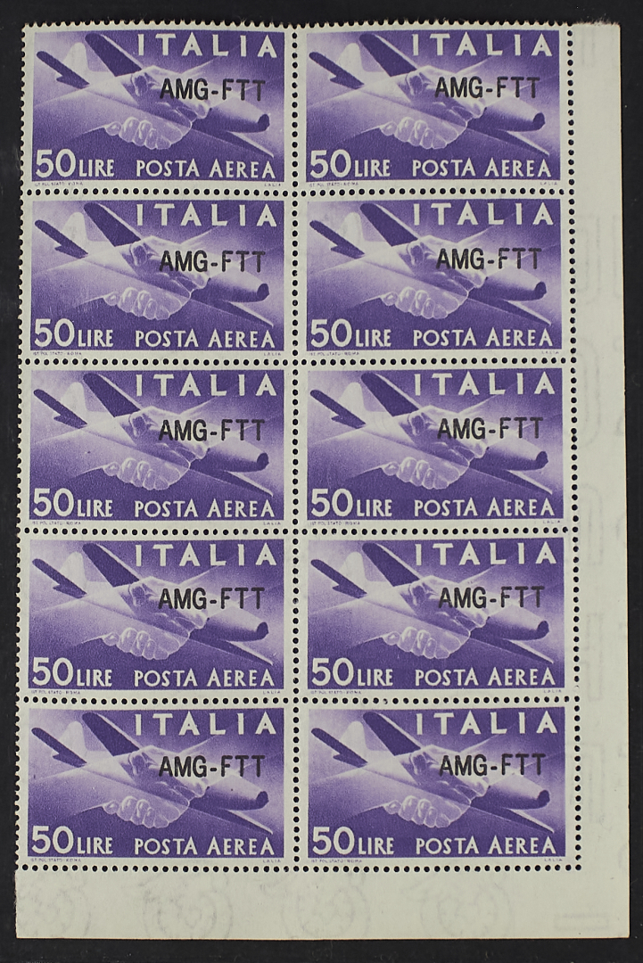 1954 - Nuova soprastampa 50 L. blocco di dieci esemplari angolo di foglio inferire destro