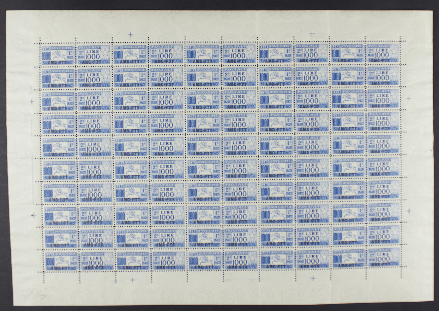 1954 - Cavallino 1000 L. oltremare dent. lineare 13 3/4 - Il foglio completo di 50 esemplari