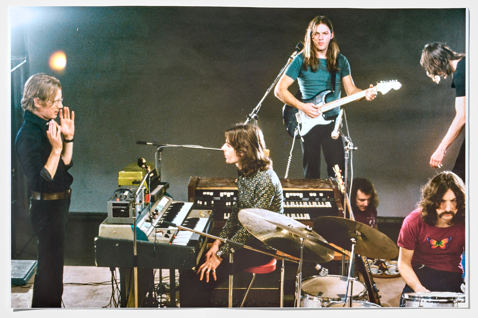 Da sinistra a destra: il regista Adrian Maben, il tastierista Richard Wright, il chitarrista, compositore e cantante David Gilmour, il batterista Nick Mason e il bassista, cantante e compositore Roger Waters, tutti membri dei Pink Floyd, durante le riprese di “Live at Pompeii” allo Studio Europasonor di Parigi, Francia, dicembre 1971