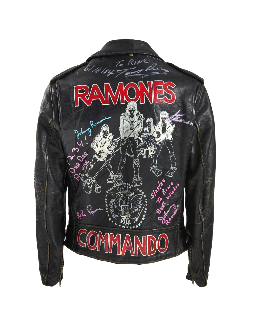 Giacca in pelle autografata personalmente dai membri dei Ramones in occasione di un incontro di un devoto fan che organizzò un viaggio per incontrare il suo idolo, Joey Ramone, frontman della famosa band. Quell'occasione venne commemorata grazie a fotografie che ritraggono il fan, Rino Ramone, con tutti i componenti del gruppo, che si erano appositamente incontrati per esaudire il suo desiderio di conoscerli personalmente