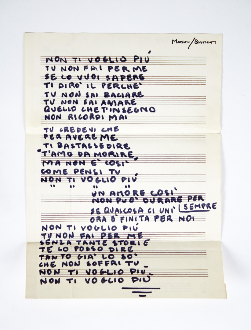 Rarissimo spartito di canzone presentata agli organizzatori del Festival di Sanremo, ma mai selezionata per la gara. Musica scritta da Battisti, testo scritto da Battisti e modificato estesamente da Matano. L'incombenza di scrivere toccava sempre a Battisti che era più preciso